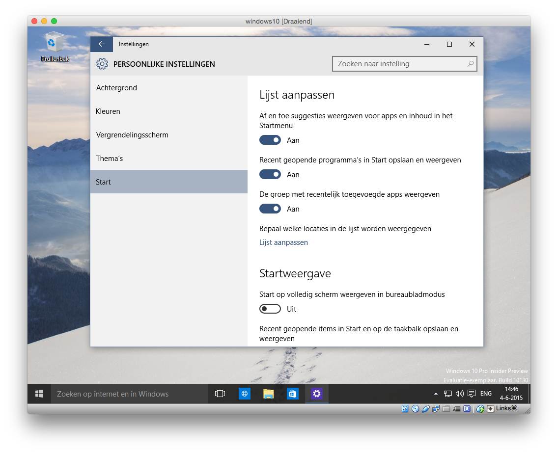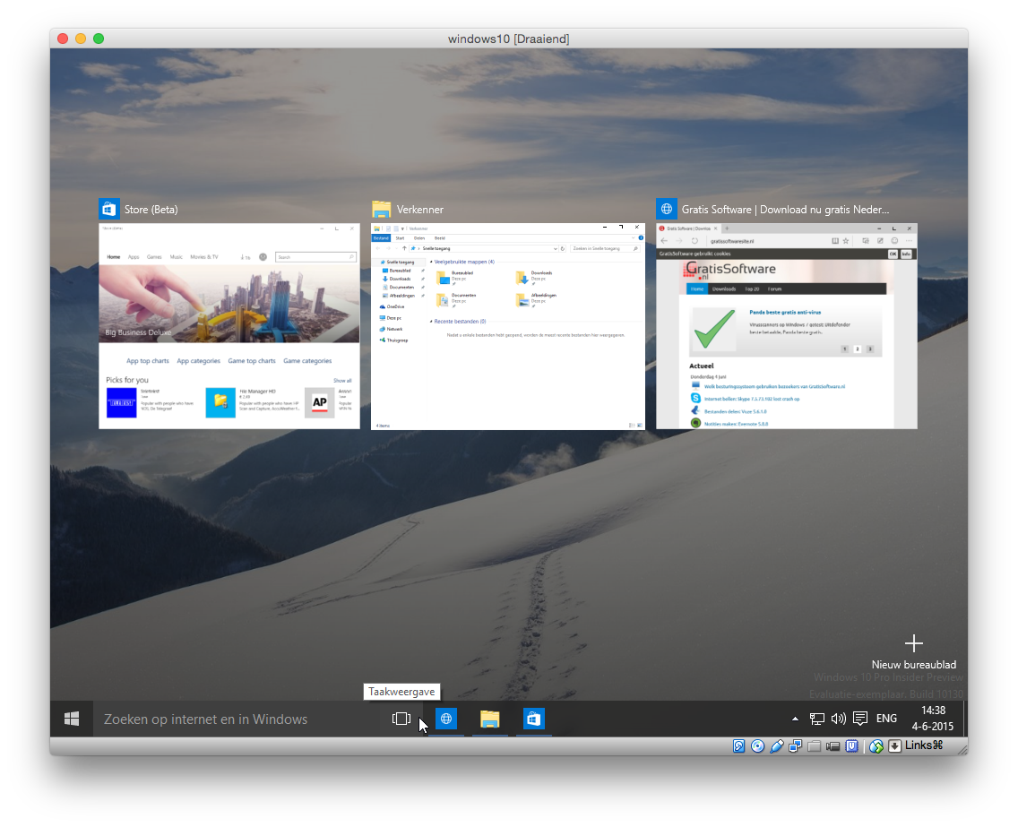 Nog een kleine twee maanden en dan is het zover: Windows 10 verschijnt. Als je Windows 7 of 8/8.1 hebt dan kun je vanaf 29 juli gratis upgraden naar de nieuwste versie van Microsofts besturingssysteem. Windows 10 Preview is al driekwart jaar uit te testen voor Windows Insiders. Maar voor mensen die de proefversie van Windows 10 nog niet geprobeerd hebben, hier een kleine rondleiding. Je kunt klikken op alle afbeeldingen voor een grotere weergave (de afbeeldingen zijn genomen van Windows 10 Preview build 10130 draaiende in VirtualBox onder Mac OS X).