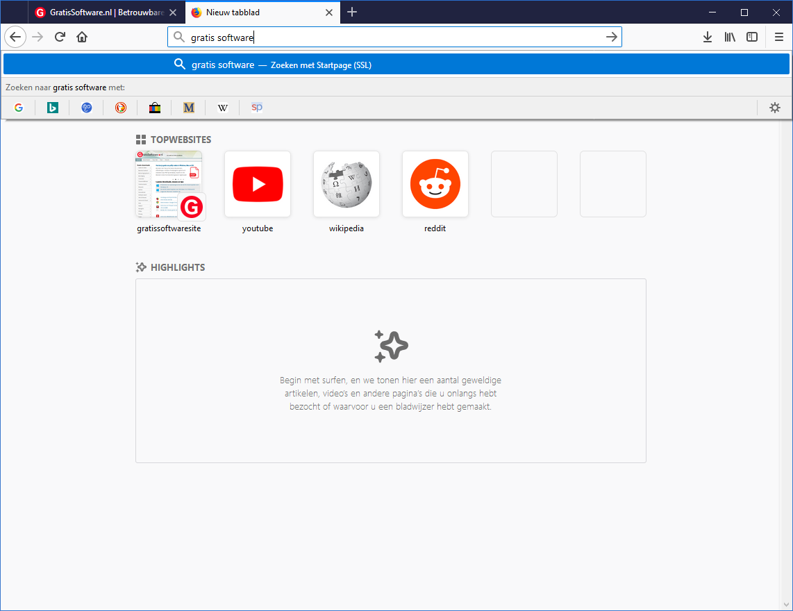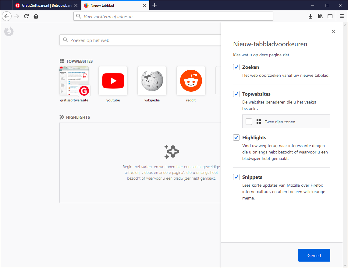 De nieuw tabblad-pagina (nieuw tabblad krijg je als je op + klikt in de tabbladenbalk) is iets gewijzigd, maar toont nog een zoekbalk, je favoriete websites en meer. Als je op het tandwieltje rechtsboven op deze nieuw tabblad-pagina klikt kun je aanpassen wat je te zien krijgt door de vinkjes weg te halen bij bijvoorbeeld topwebsites, highlights en snippets (nieuws van Mozilla):