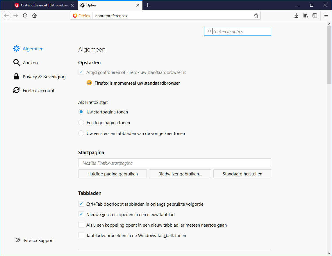 De Opties zijn ook - al iets eerder - op de schop gegaan (Drie-streepjes-menu | Opties) en bestaan nu uit vier onderdelen, genaamd Algemeen, Zoeken, Privacy & Beveiliging en Firefox-account. Bovenaan is een nieuw zoekvenster waar je altijd de gewenste instellingen kunt vinden door te zoeken in opties.