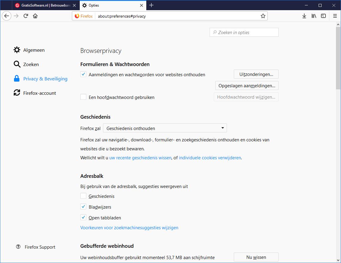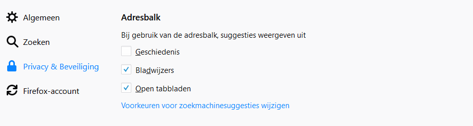 Ook kun je hier kiezen welke suggesties Firefox in de adresbalk mag geven (automatisch aanvullen van urls). Als je bijvoorbeeld niet wilt dat die uit je surfgeschiedenis komen dan kun je dit uitvinken: