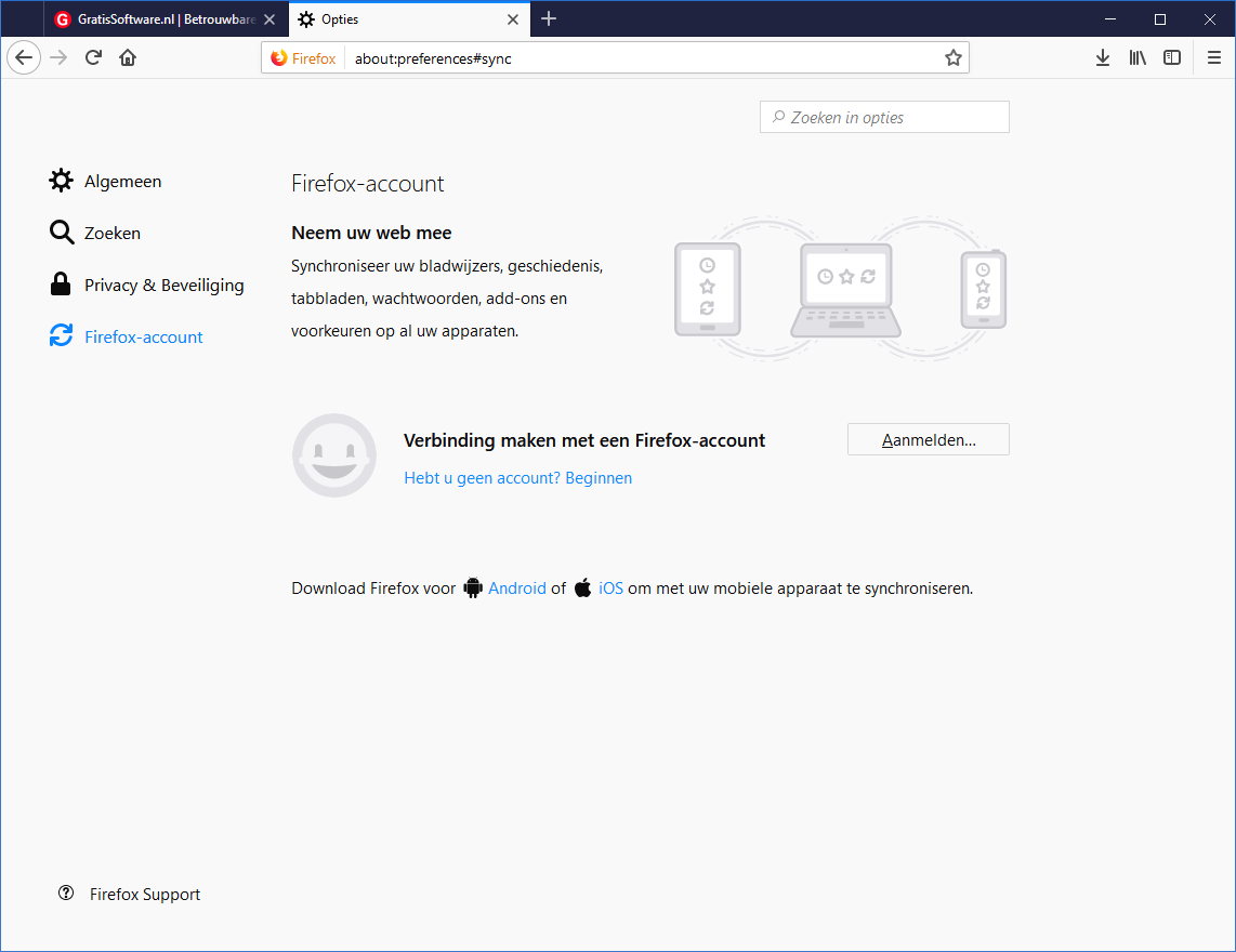 Als je je aanmeldt voor een Firefox-account kun je bladwijzers, tabbladen, wachtwoorden en instellingen synchroniseren tussen Firefox op je pc, laptop, Android-toestel en iPhone of iPad. Gemakkelijk, maar dit hoeft natuurlijk niet: