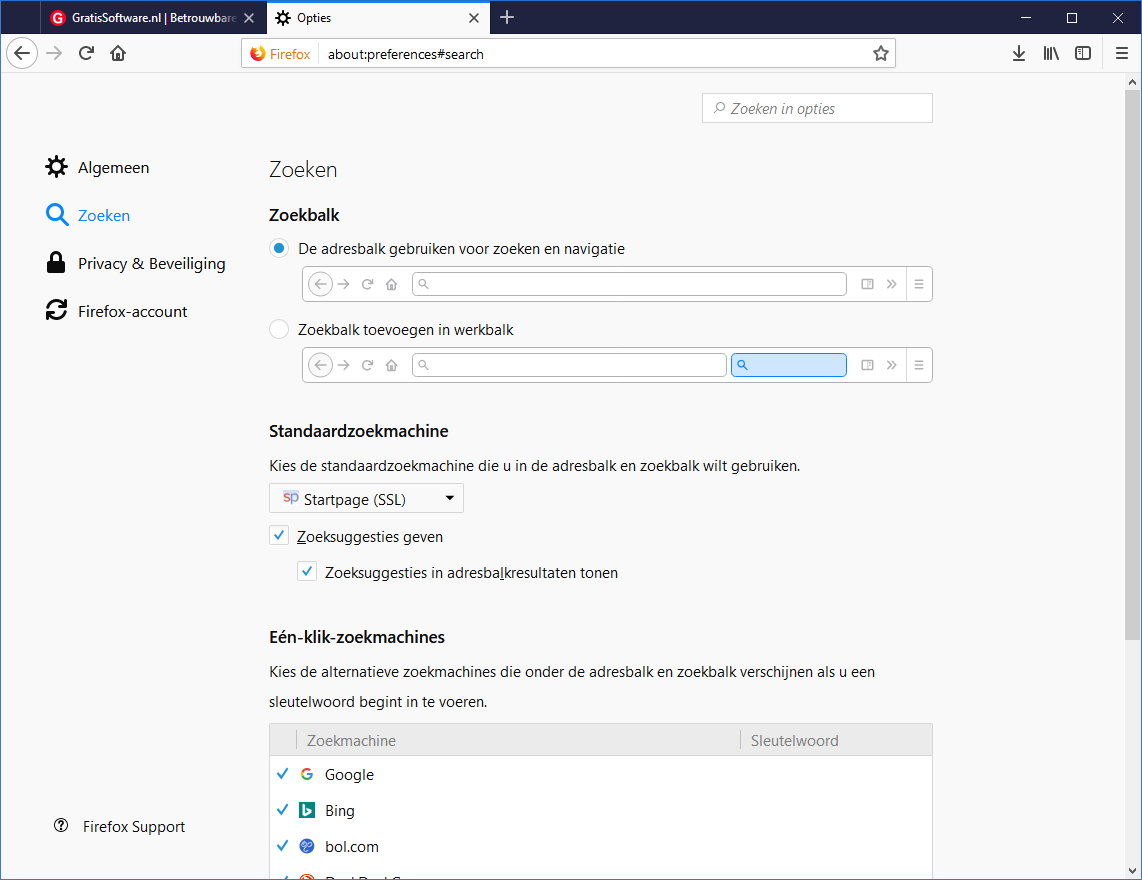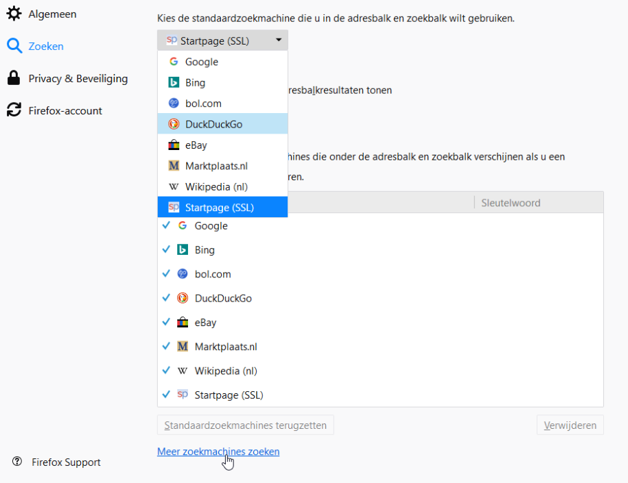 Bij Zoeken kun je instellen dat je toch een losse zoekbalk wilt. Hier kun je ook je standaard-zoekmachine wijzigen als je geen Google wilt (kies één uit het uitklapmenu onder Standaardzoekmachine) en onderaan kun je zoekmachines (zoals Startpage) toevoegen door te klikken op Meer zoekmachines zoeken: