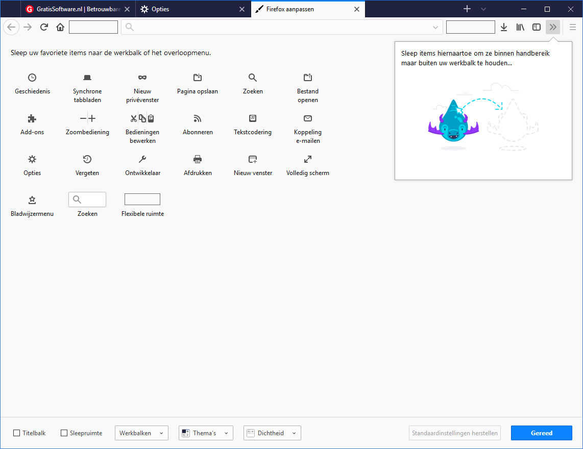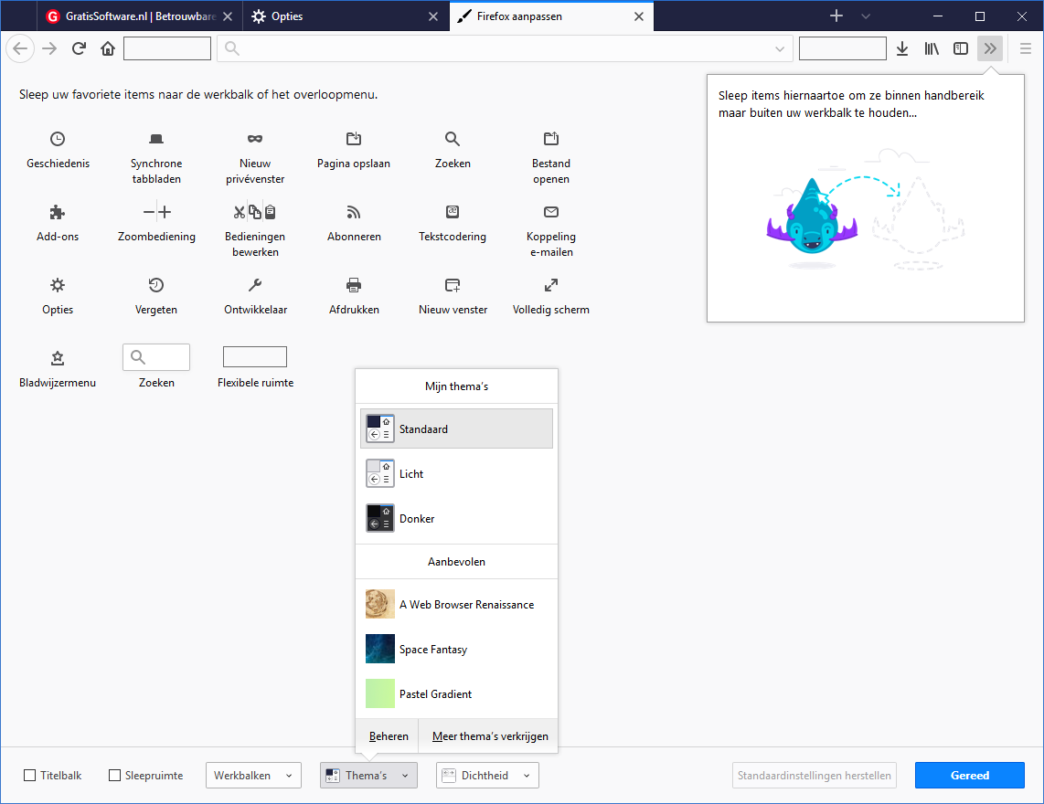 Bij Aanpassen kun je ook het thema van Firefox aanpassen (Standaard, Licht, Donker en meer: het lichte thema maakt overigens de donkerblauwe tabbladenbalk grijs) en de dichtheid van het menu: