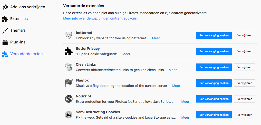 Ten slotte de add-ons of extensies. Vanaf Firefox 57 werken extensies die niet zijn omgezet naar web- extensies niet meer. Onder driestreepjes-menu | Add-ons - Extensies zie je welke van je extensies nog werken. Onder het kopje Verouderde extensies zie je extensies die nog niet zijn omgezet naar het nieuwe web-extensie systeem. Sommige (zoals NoScript) zullen binnenkort of later nog worden omgezet, maar andere extensies zullen geen update meer krijgen. Daar zul je dus een vervanger voor moeten zoeken. Firefox maakt het je makkelijk door hier een blauwe knop te plaatsen met de naam Een vervanging zoeken. Klik hier op en je wordt naar een alternatief geleid, of naar extensies uit dezelfde categorie. En kijk ook in ons artikel over de status van extensies voor vervangers - en informatie of jouw favoriete add-on nog omgezet wordt.