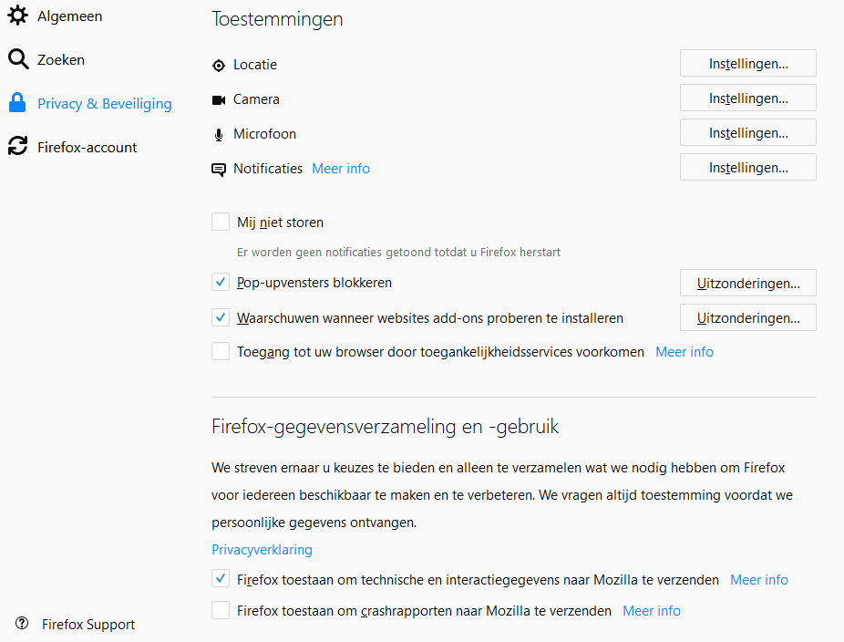 Als laatste kun je toestemmingen die je gegeven hebt aan websites voor het gebruik van je locatie, camera en microfoon en het geven van notificaties wijzigen. Ook kun je aan- of uitvinken of Mozilla geanonimiseerde gegevens (want Mozilla respecteert je privacy) mag verzamelen om Firefox beter te maken: