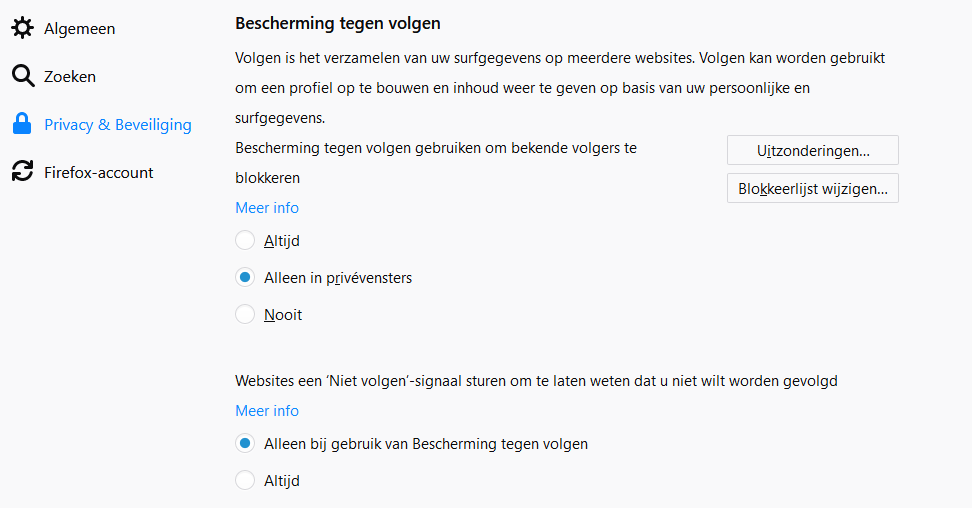Verder kun je de bescherming tegen volgen (protectie tegen advertentie-trackers) inschakelen voor alleen privé-vensters (standaardinstelling Firefox) of voor alle vensters die je opent (dus altijd). Hierdoor kunnen advertentiebedrijven als Google en Facebook je minder goed volgen, maar soms werken websites hierdoor niet meer naar behoren: