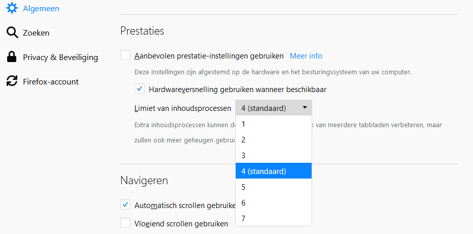 Voor gevorderden: onderaan bij Opties | Algemeen | Prestaties kun je de limiet van inhoudsprocessen verhogen. Maar doe dit alleen als je weet wat je doet en waar dit over gaat, anders kunnen de prestaties van Firefox nadelig beïnvloed worden!