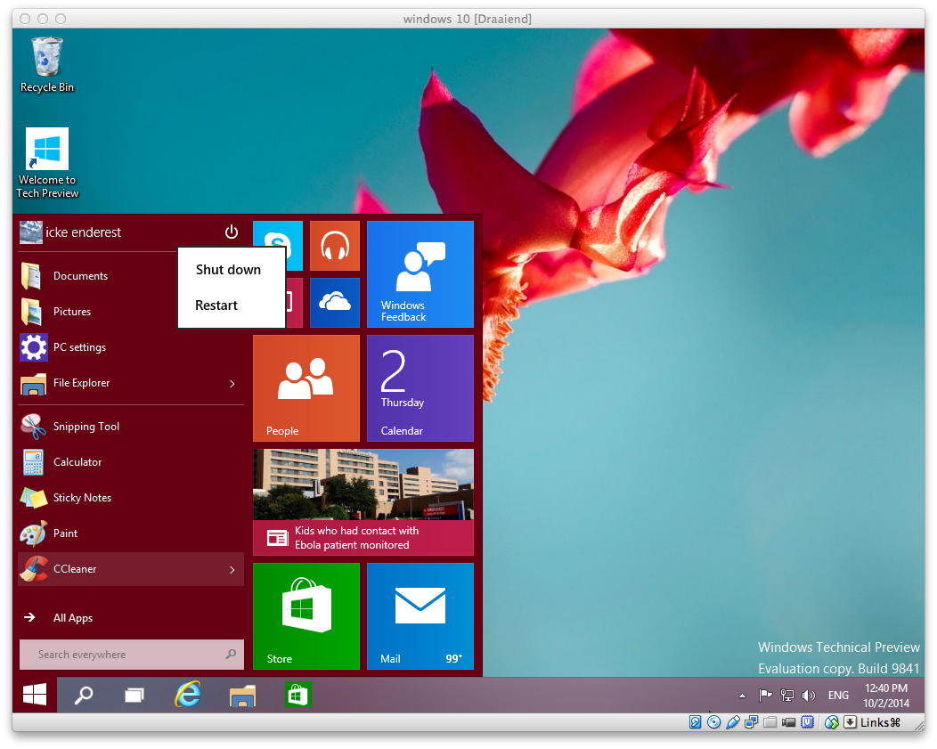 ja ik vindt ook de windows 10 peview een mooie nieuwe komer wat ik wel mis is dat je wel de internet explorer als tegel zo als in windows 8.1 pro kunt neer zettenmaar als ik dan op die tegel klik gaat hij niet open het lijkt er dan ook op dat of hij is nog niet goed bij gewerkt of hij is alleen te gebruiken in de dekstop versie in windows 8 kon je hem heel mooie in het hele scherm gebruiken zonder onderbalken wie weet of dit ook kan in de technical preview 10 verders is hij zeker echt mooi